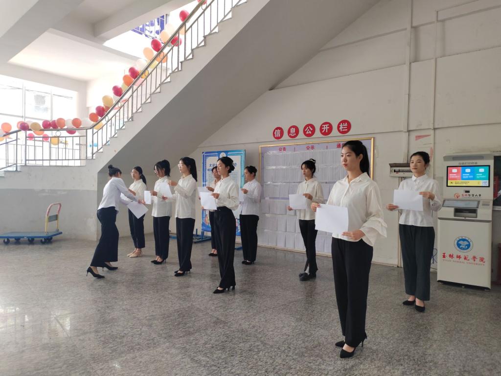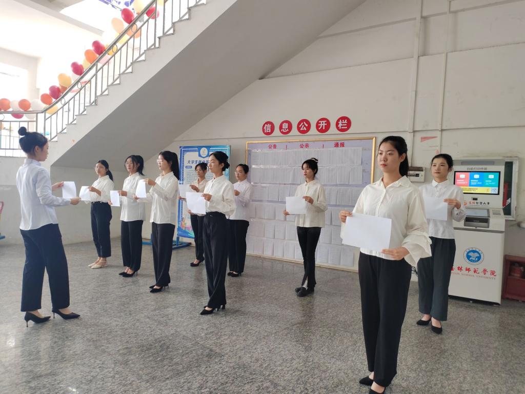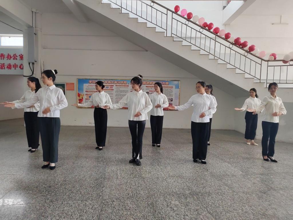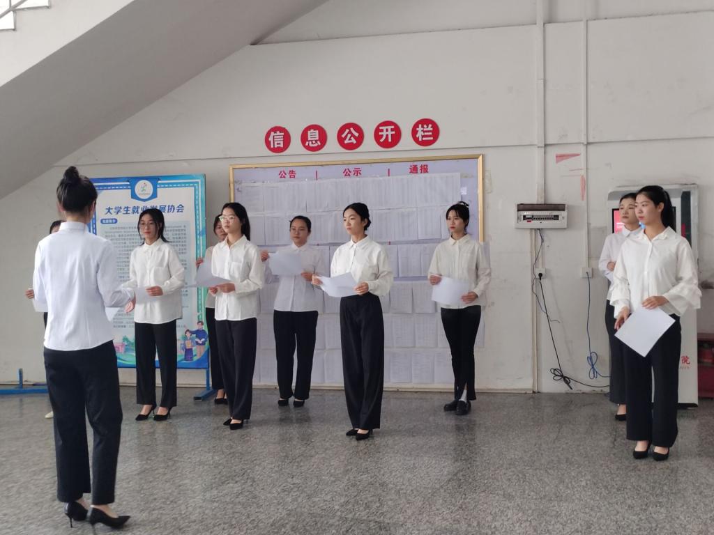 在培训中,校礼仪团副团长从妆容礼仪、仪态礼仪两方面对参训员工进行指导和示范,并对本次礼仪活动的规则进行详细讲解。在校礼仪团副团长的指导下,参训员工进行站姿、走姿、礼仪引导等常用礼仪姿势的练习。在一遍又一遍的练习中,礼仪队成员面带微笑,自信迈步,迅速连贯地完成每一个动作,进一步掌握礼仪技巧。最后,此次培训活动圆满完成。