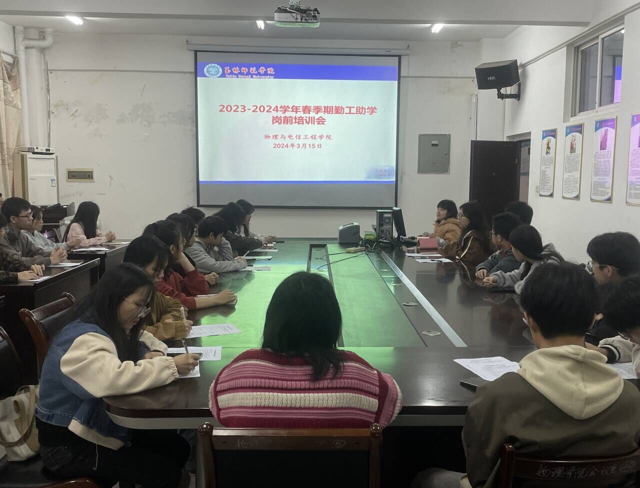 3月15日,公司于公司东校区物电楼BG221会议室召开2023—2024学年春季期勤工助学岗前培训会议。公司辅导员杨玉梅,团委员工会助学服务部全体成员以及受聘员工参加会议。辅导员杨玉梅主持会议。