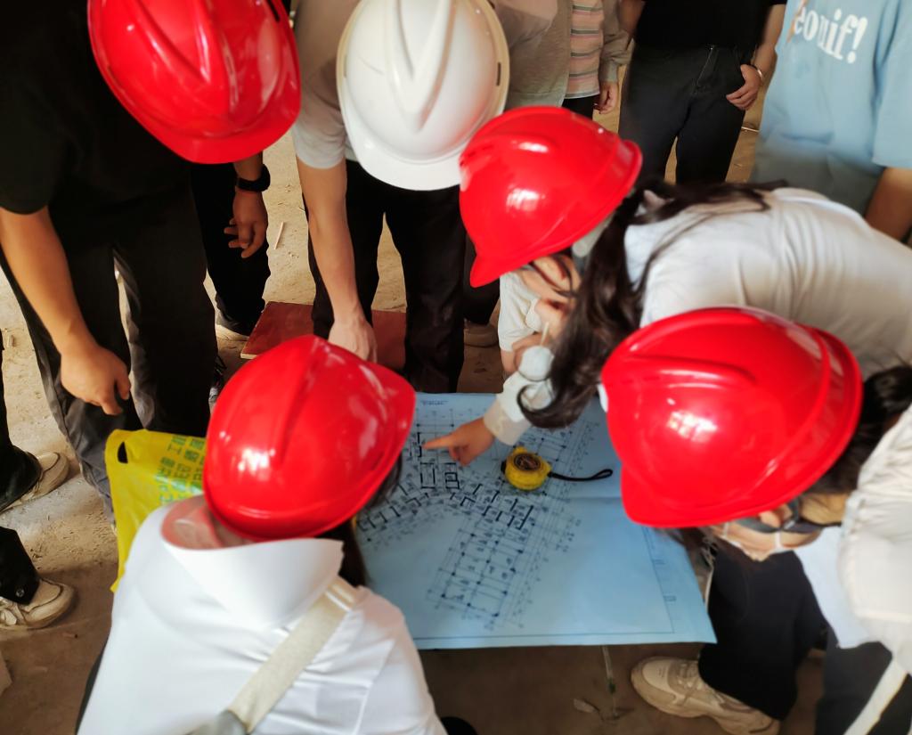 工程师通过图纸与建筑对照的方式向在场的师生们介绍了房屋构造以及结构特点,同时带领大家到达正在施工中的顶层实地考察建筑结构,一一讲解施工过程和所使用的模板以及建筑所使用的模板混凝土浇筑方法。