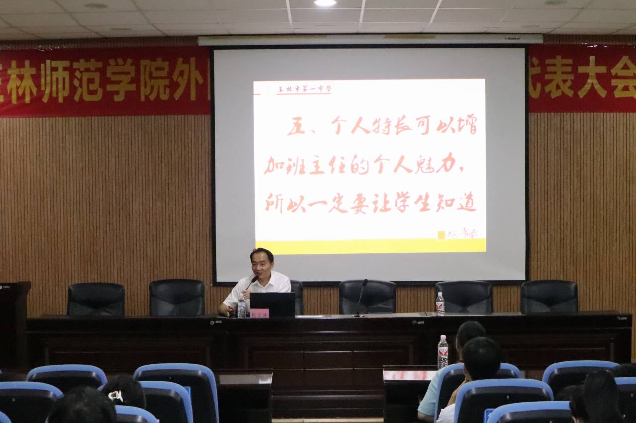 韦艳芳代表公司对杨炎坤老师的到来表示热烈欢迎,并向在场师生介绍杨老师的教学经历、成果等。随后,杨炎坤作题为“但行好事,莫问前程”讲座,从“说一段经历”、“介绍一种研究方法”、“分享几个小技巧”、“个人成长感悟”四个方面对如何做好一名班主任进行详细阐述。
