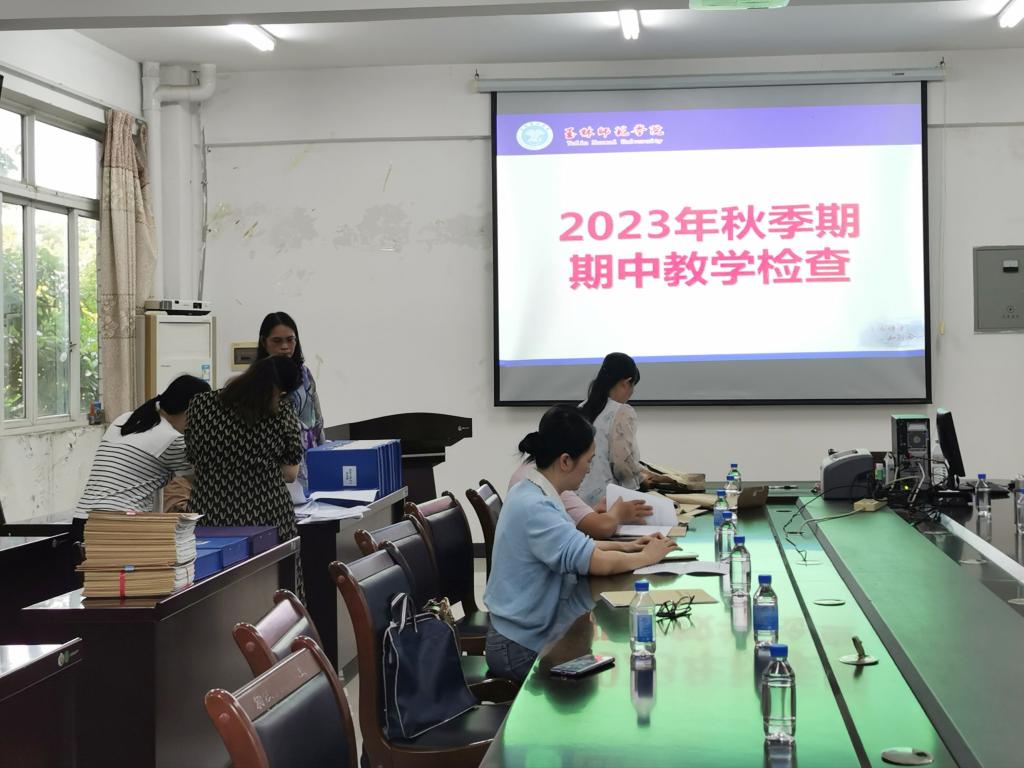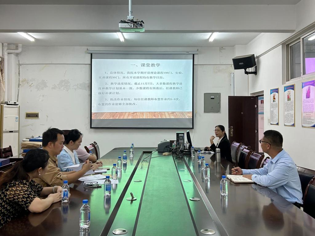 韦艳芳代表公司向检查小组作了教学工作开展和期中教学检查自查情况汇报。随后,检查小组成员对照检查通知的内容和要求,通过查阅教学资料、档案材料、现场询问等方式,对公司的教学安全管理、教学质量监控情况、教学档案、青年教师培养情况、实验教学情况等进行常规教学检查,对试卷材料进行专项检查。最后,检查小组反馈检查结果,提出针对性的意见建议。