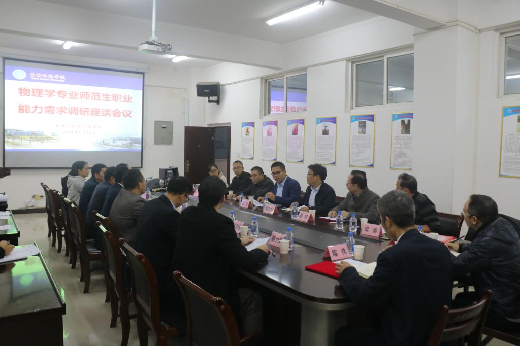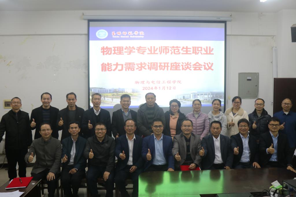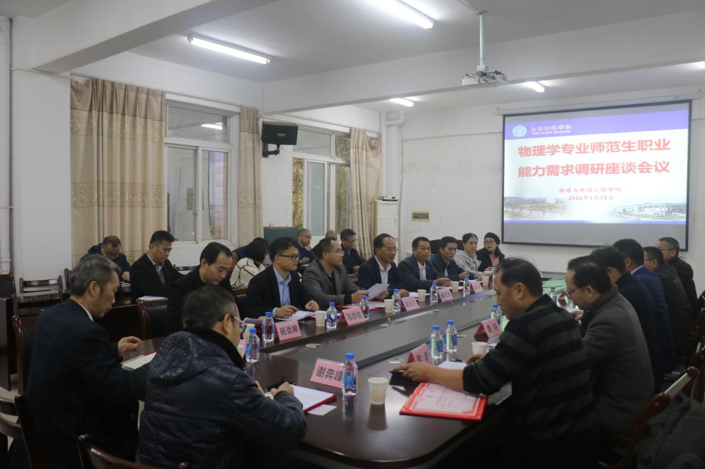 1月12日下午,太阳成tyc33455ccwww于东校区物电楼BG221会议室召开物理学专业师范生职业能力需求调研座谈会。参加调研座谈会的有来自玉林市教育科学研究所、玉林高级中学附属初中、玉林市第一中学、容县高级中学、北流高级中学等单位的领导和名师;公司经理巫钊、副经理罗志荣、副经理张文杰以及物理学专业相关教师。