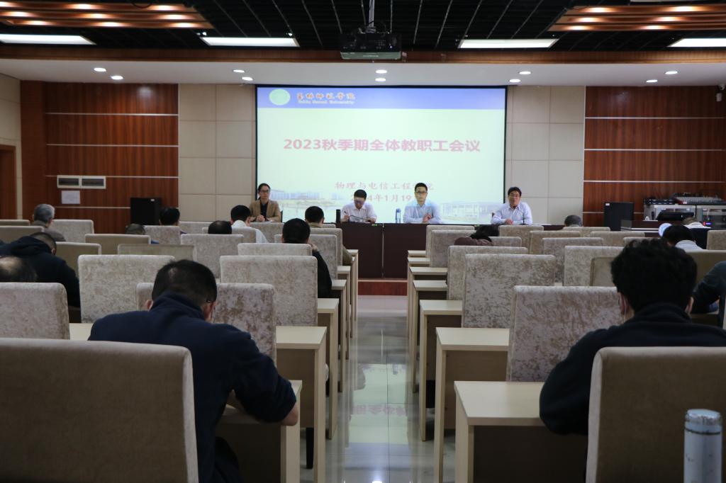 1月19日下午,公司于东校区教师能力发展中心青年论坛召开2023年秋季期全体教职工会议。公司党委书记陈铁军,经理巫钊,党委副书记兼副经理覃艳超,副经理罗志荣以及全体教职工参加会议,会议由陈铁军主持。