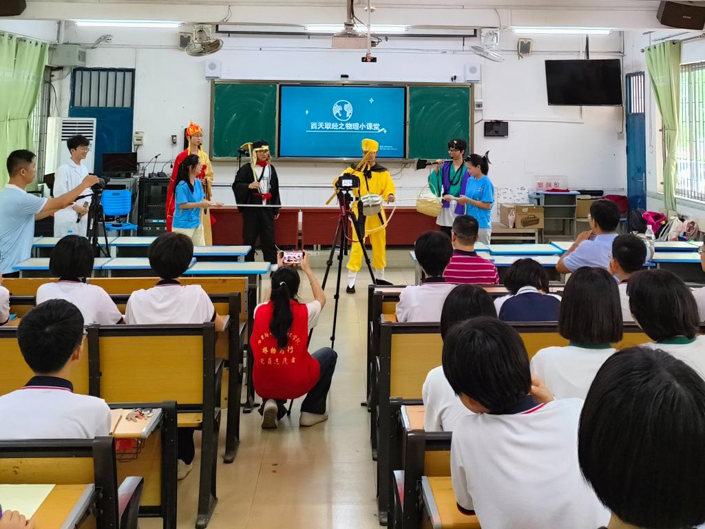 活动中,巫钊经理围绕科技与生活主题,向现场师生科普物理在人工智能、航空航天、工程材料等领域的应用。随后,员工党员志愿者们借助古典名著《西游记》西天取经故事,向师生们介绍物态变化、马德保半球实验等物理实验,通过情景剧表演巧妙将物理知识与故事内容深度融合,激发同学们对物理学习的好奇心和兴趣,点燃他们的科技梦想。