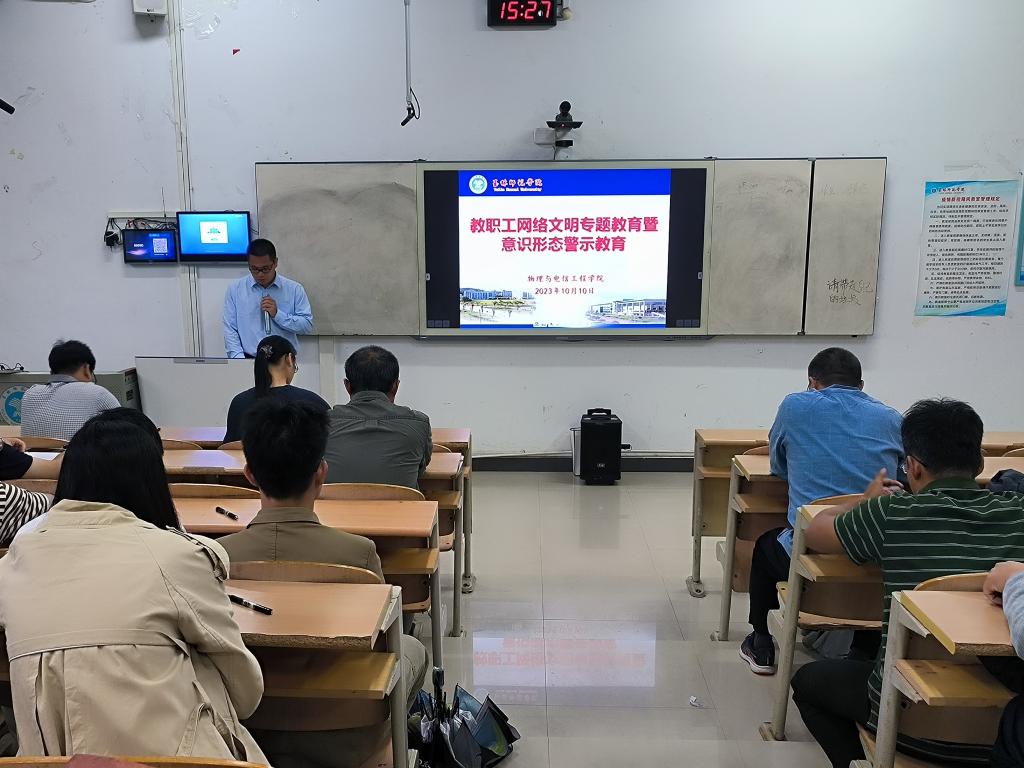 10月10日,我院在公司东校区文科楼105教室召开教职工网络文明专题教育暨意识形态警示教育会议,公司领导班子成员以及全体教职工参加会议。会议由副经理巫钊主持。